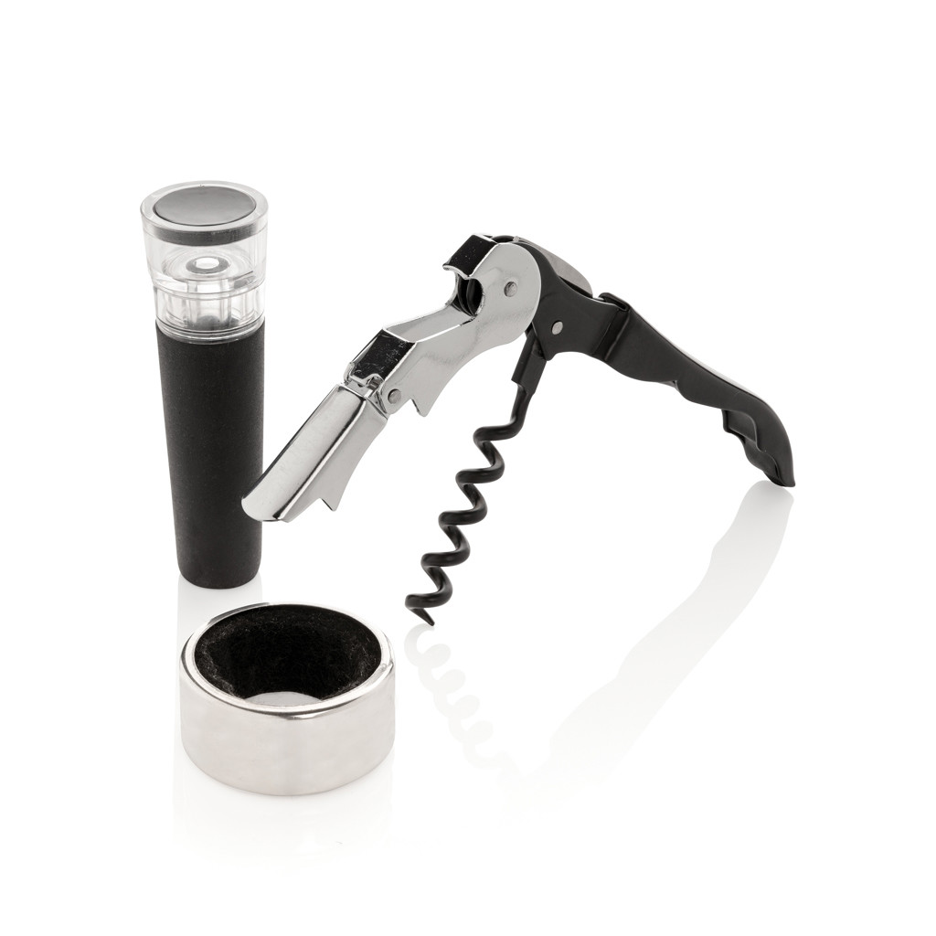 Have everything you need to open and serve your favourite wines with this 3 pcs wine set. The set consists of a waiter's corkscrew, wine stopper and drip ring. Packed in a luxury gift box.