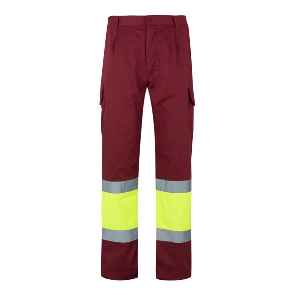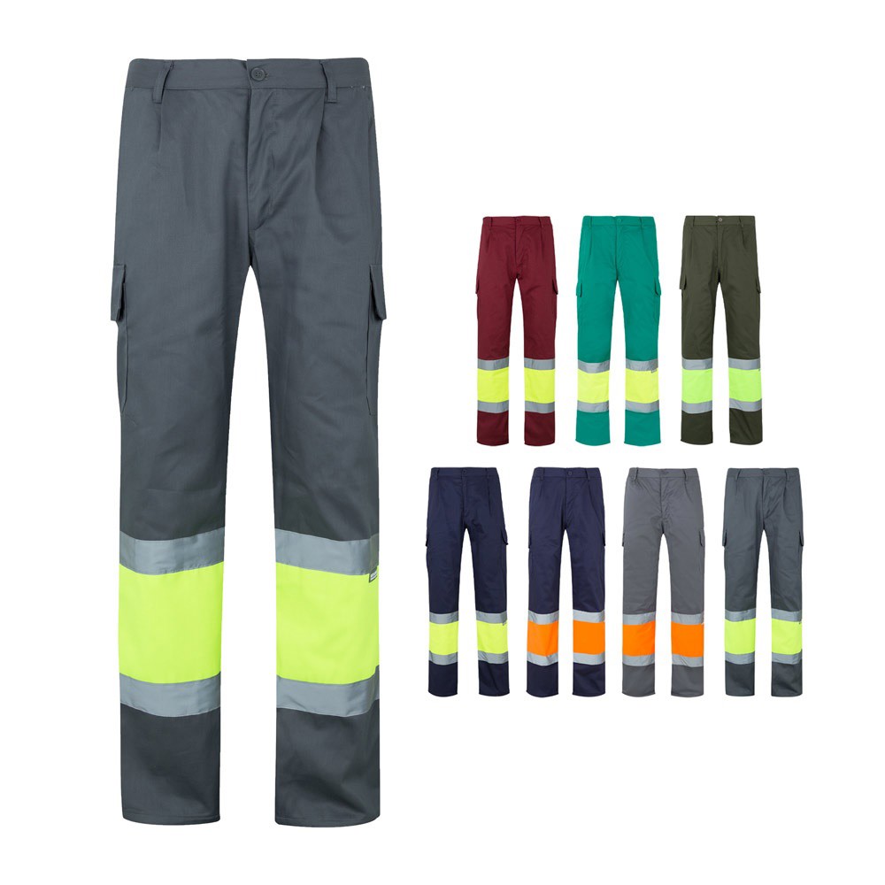 Two-tone twill trousers (210g/m²), lined, multi-pocket, in cotton (20%) and polyester (80%). With elasticated waistband, with reflective stripes on the bottom of the trousers. Contains six pockets (2 French pockets, 2 side bellows pockets and 2 back pockets). Product in compliance with EU Reg. 2016/425, certified by EN20471 and class Nº 1. Size: S, M, L, XL, 2XL, 3XL