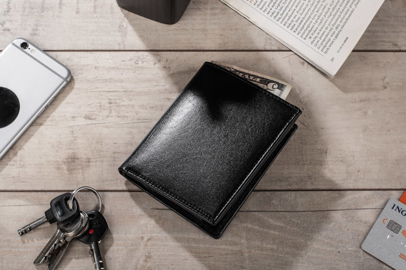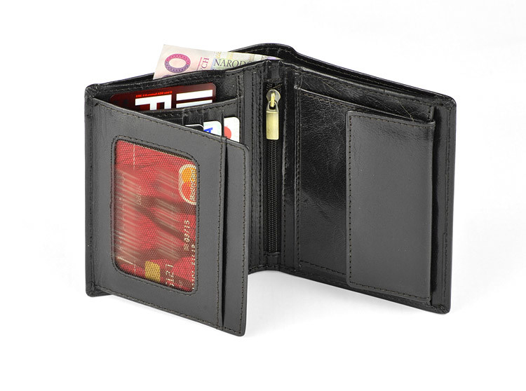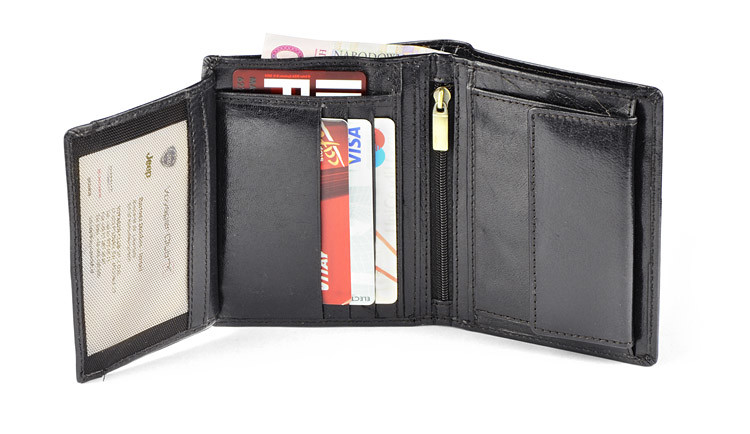 Leather wallet containing a pocket for coins, 2 pockets for notes, 4 holes for credit cards and 5 pockets for the documents and one zipped pocket. The wallet is packed individually in a wooden box. Additionally the wallet has a protective film blocking RFID signal, which prevents from stealing data from credit cards.