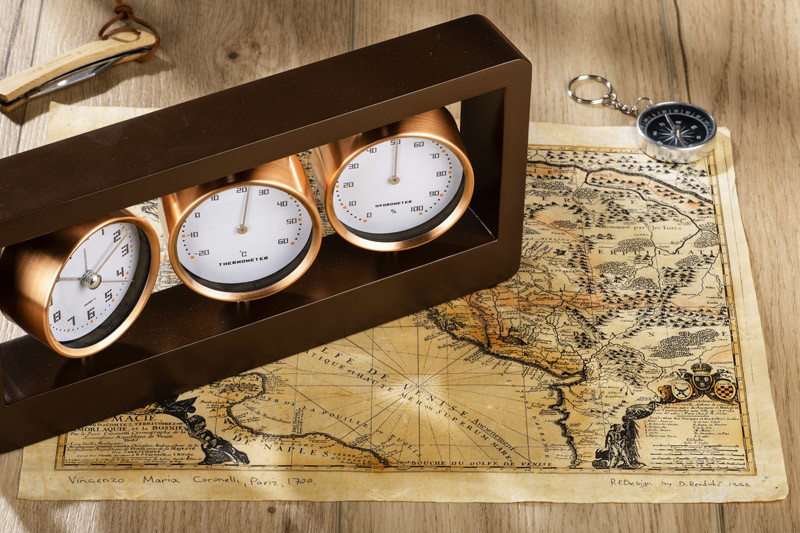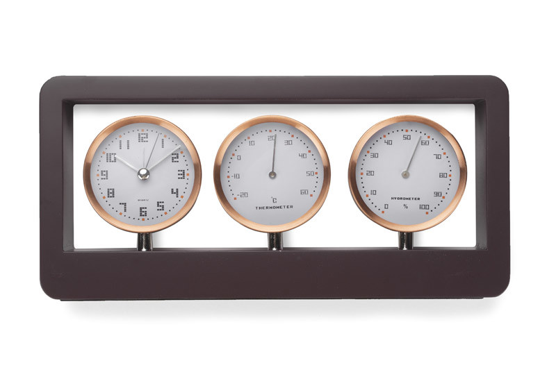 Clock with an alarm-clock, thermometer and hygrometer put into a wooden casing. It requires 1pc of AA battery which is not included to the article.