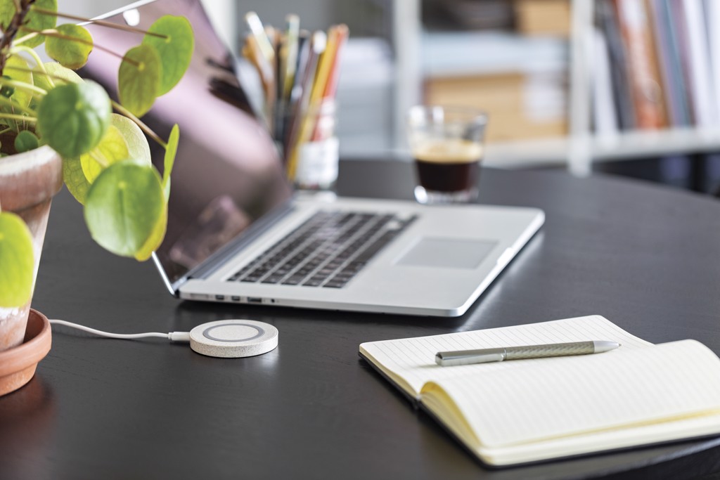 Wireless charger made from wheat fibre (15%) mixed with ABS to charge all wireless devices. With silicone ring that prevents your phone from sliding around. The LED indicator will light up when the device is charging. Compatible with all QI enabled devices like Android latest generation, iPhone 8 and up. Input: 5V/1.5A. Wireless Output: 5V/1A, 5W. Including 50 cm PVC free TPE micro USB cable.