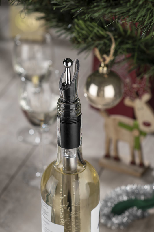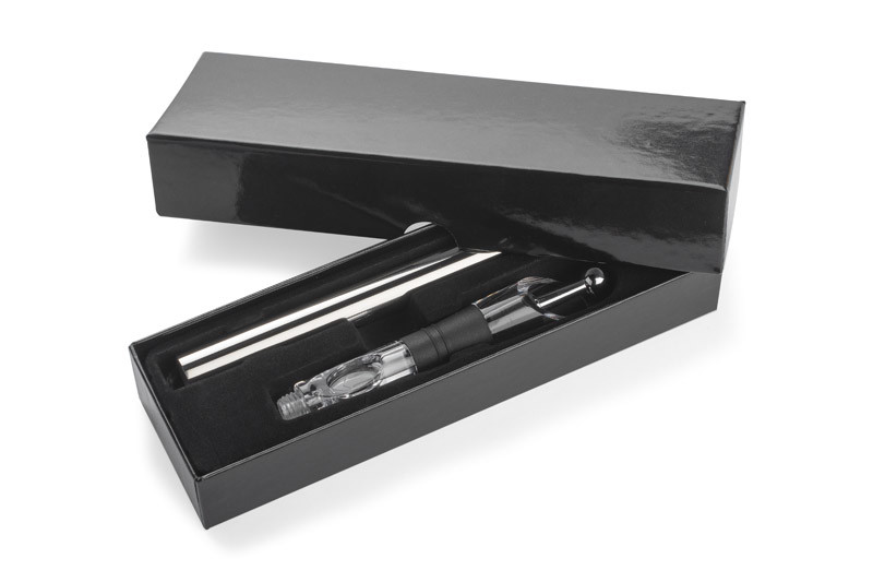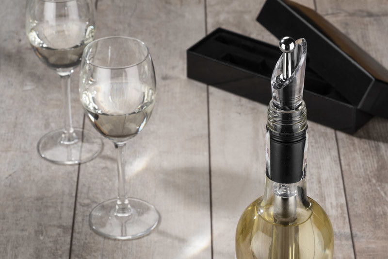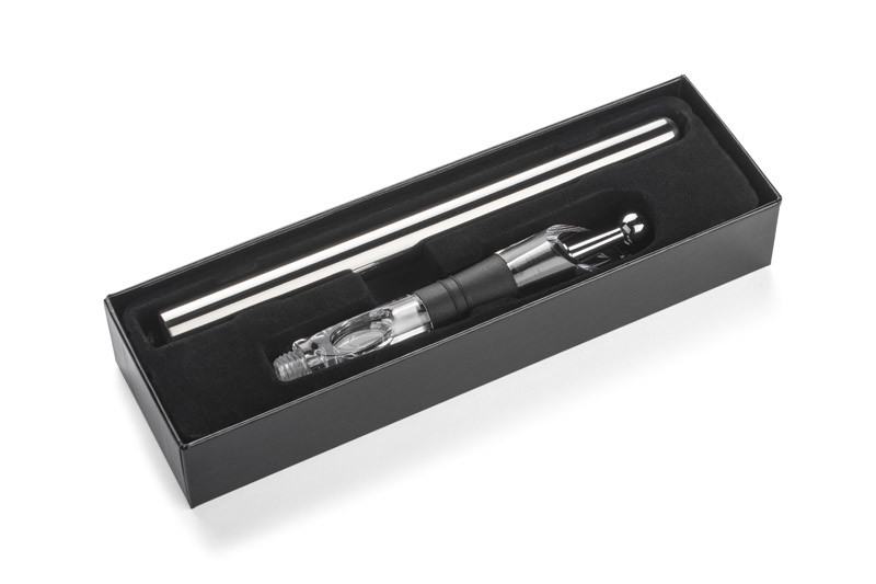 This product is a real treat for wine lovers. It has lots of usefull functions: thanks to a special filling it keeps a proper temperature of a wine, it airs the wine so that you can feel it's best flavor, you can keep all aroma inside of the bottle thanks to a closable stopper. A detachable colling filling should be kept in a freezer before using. All elements are packed in an elegant black box.