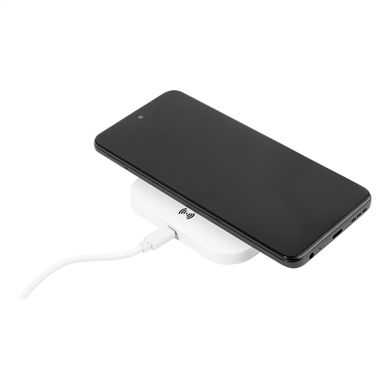 Plastic wireless charger (10W) with 2 USB charger ports. Max output 2100 mA. Including USB charger cable.