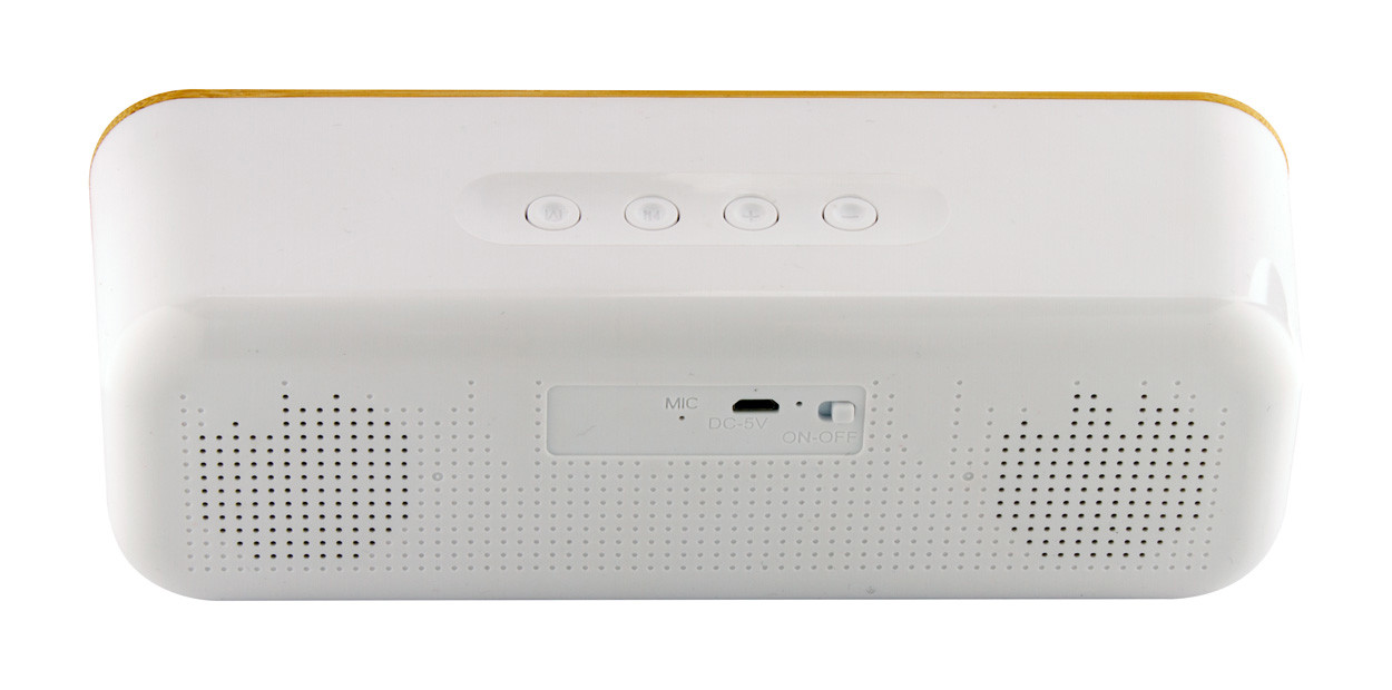 Wireless speaker in recycled ABS and bamboo housing with 2 speaker drivers and built-in rechargeable battery. With hands-free call and FM radio functions. Including USB charger cable.