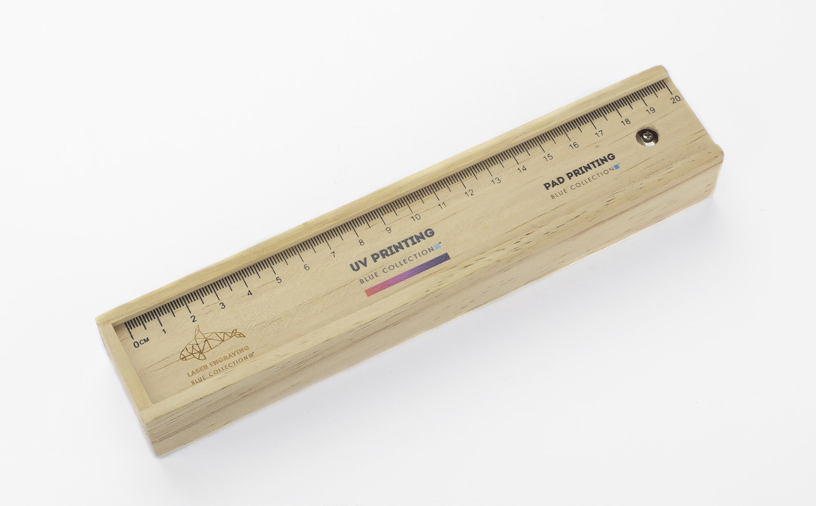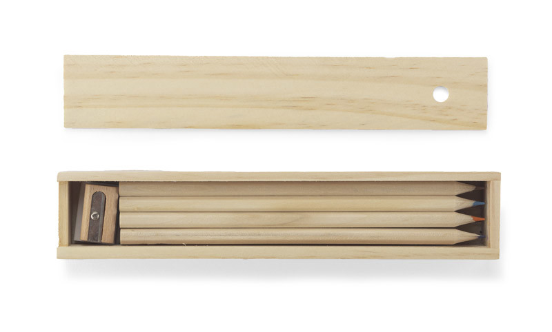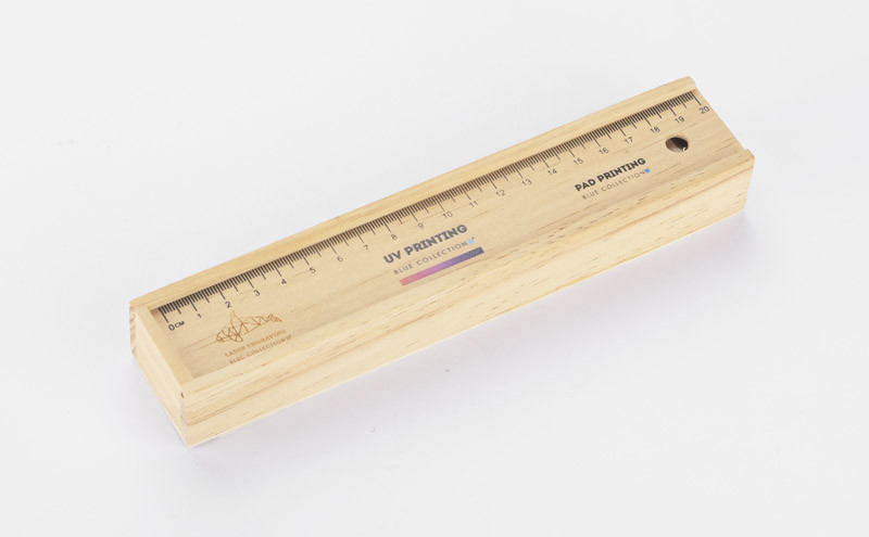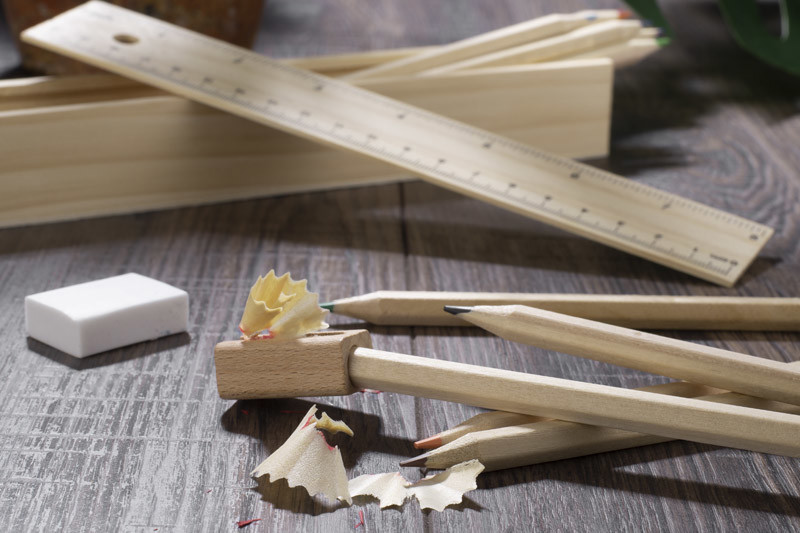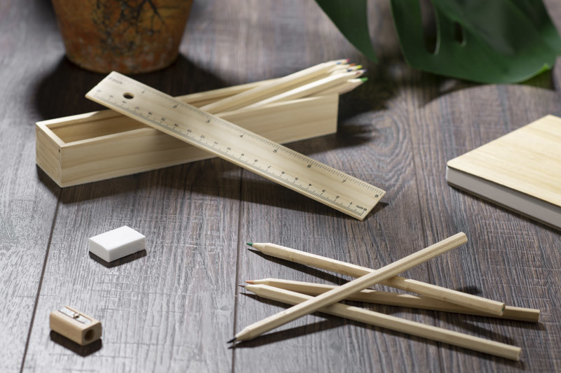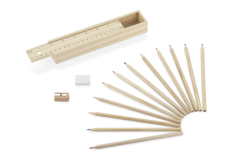 Wooden pencil case equipped with 12 various colour pencils, ruler and an eraser. Logo might be engraved directly on the box.