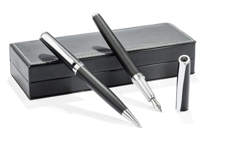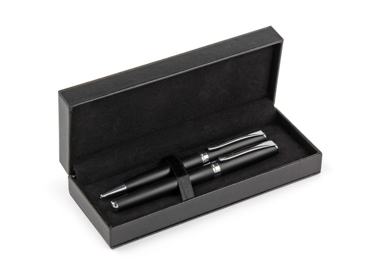 GEORGIA is an elegant writing set consisting of a ballpoint pen and a fountain pen. The writing instruments made of metal are packaged in a black leather-like material (PU) case. Ballpoint pen with twist mechanism. The fountain pen comes with one ink cartridge. The refill of the pen and the ink of the pen cartridge in black.Packed in a black cardboard box or white sleeve.
