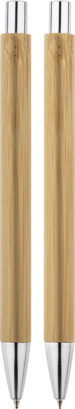 The MAMBOO writing set consists of a pen and an automatic pencil, packed in a brown eco-friendly cardboard box. The body of both pen and pencil is made of natural bamboo. Chrome finish gives it elegance. Blue pen refill, mechanical pencil 0.7 mm thick.