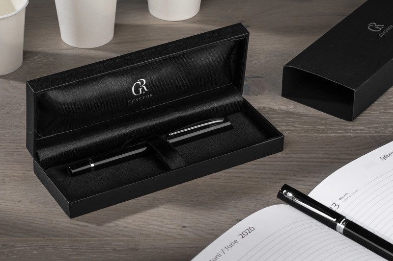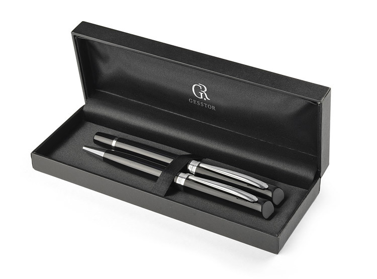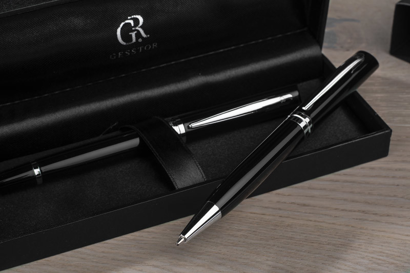 A writing set of classic elegance containing a ballpoint pen and a rollerball pen. Packaged in a box made of leather-like material (PU). All elements of the set marked with a subtle GESSTOR brand logo denoting products of exceptional quality and beautiful design. Dimension of the pen - 139 x 12mm, dimension of the pen - 138 x 12 mm.