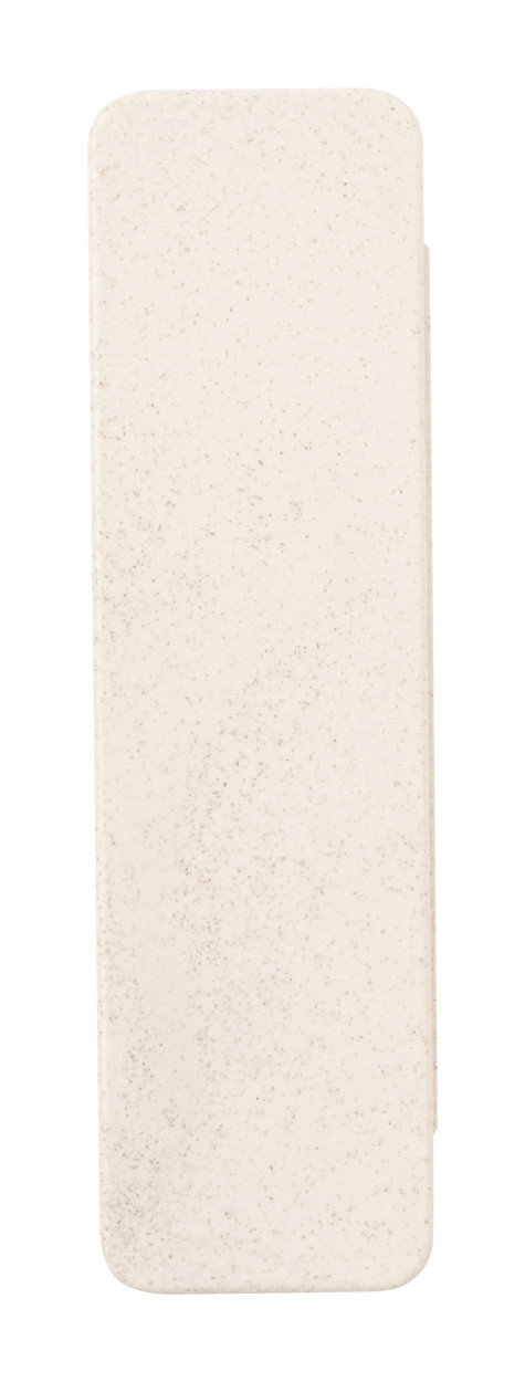 5 pcs writing set in ecological wheat straw plastic case. Including wooden lead pencil, recycled paper and wheat straw plastic ballpoint pen with blue refill, 15 cm ruler, wooden sharpener and eraser.